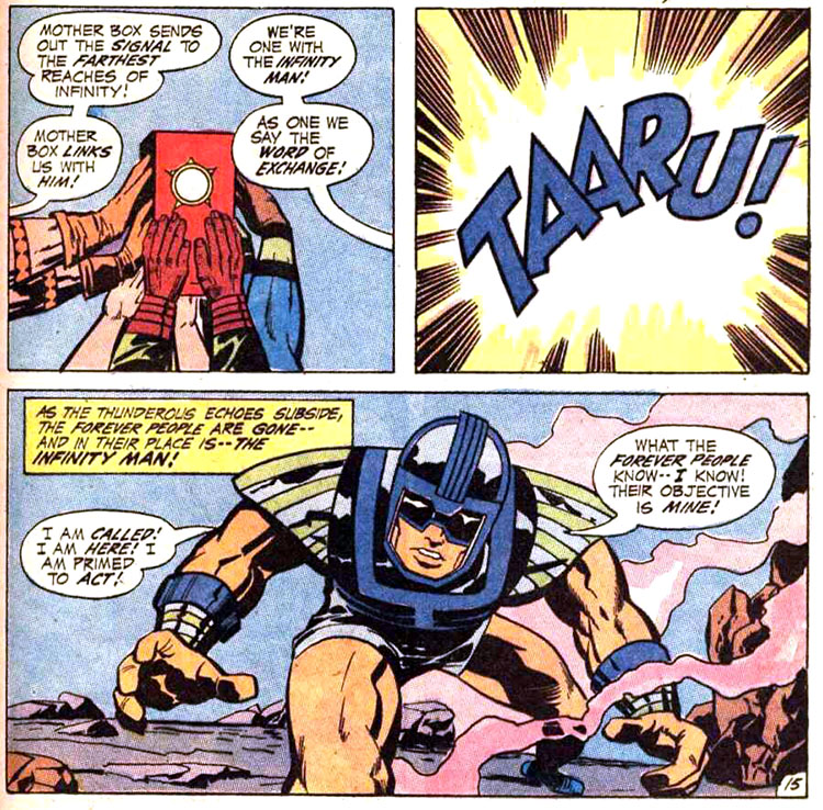 The Forever People first came to Earth when Beautiful Dreamer had been kidnapped by Darkseid. He believed that she could interpret the elusive Anti-Life Equation. If mastered, the Equation would provide total control over living things. The boys' presence drew the attention of Superman. They assumed that because he had great powers, he was also from New Genesis. Indeed, this made Superman wonder if he was. Each of the youngsters had their own unique abilities, but when they touched their Mother Box together and cried "TAARU!", they swapped places with a cosmic warrior called the Infinity Man. Together they drew out Darkseid, who had already given up on Dreamer. He released her saying she did not have the knowledge he sought. (Forever People vol. 1 #1) Note: This was their first appearance in print.