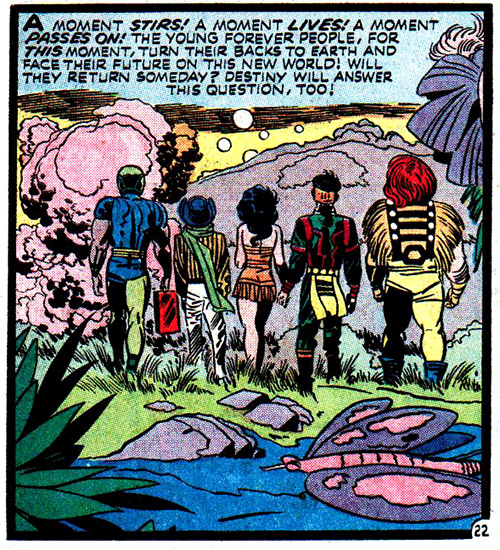 Their repose was short-lived because Darkseid changed his mind and attacked them anew. He unleashed his agent, Devilance the Pursuer, a powerful bounty hunter whom the Forever People could not defeatst. They fled across the globe until their Mother Box was able to reestablish contact with the Infinity Man. The hero had made constant attempts to return but failed to penetrate the barrier around his area of space. The connection reestablished, the Infinity Man returned and challenged the Pursuer and both were apparently destroyed in a conflagration when the villain's lance exploded. The Forever People were thus stranded in another universe on the paradise planet called Adon, unable to switch places again. (#11)