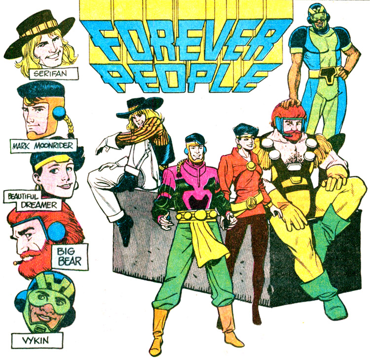 The Forever People are a youthful group of pacifistic New Gods who hail from New Genesis — they called its floating city "Supertown." The group traveled by way of the Super-Cycle, a great four-wheeler equipped with the ability to fly, teleport, and become intangible.