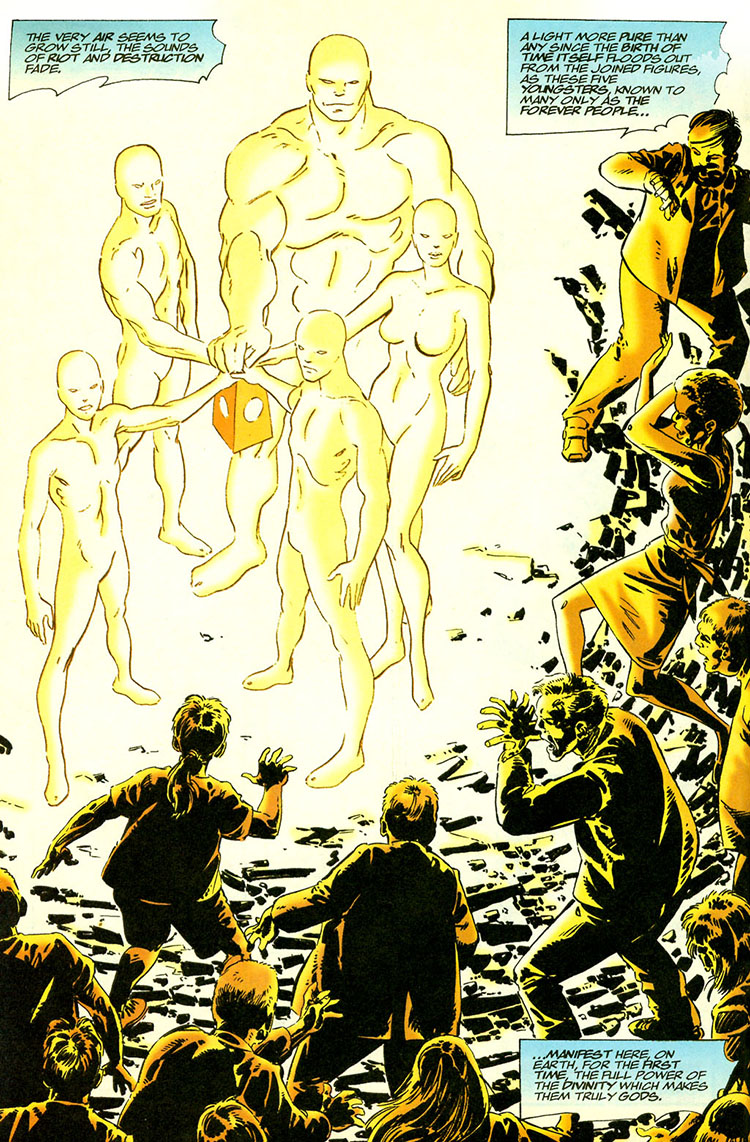 During another great threat on Earth, the Forever People attempted to stop a giant frightened mob. At Mark's request, they used their power in a new way. They joined hands upon Mother Box and were lit with divine energy, which calmed the crowd's minds and spirits and turned their thoughts to hope. (#8)