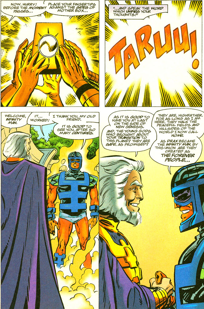 Somehow Drax made contact with his old friend Izaya on New Genesis. They made a plan that involved gathering five families together whose children were special in certain ways. The Source guided his selection and the youngsters were tutored separately from others. Each child was given a special Mother Box (a sentient, living computer connected to the Source). After training with the Boxes for five years, the children were brought back together for further indoctrination and to synchronize their thoughts, an ultimate exercise in concentration. More years later their efforts were put to a test. They produced their Mother Boxes, noting that each was differently shaped — this because they were designed to form one larger Box. Young Vykin was appointed this Box's keeper, and when the five of them touched it and chanted "TAARU," they brought forth (and traded places with) Drax, the Infinity Man. (#19)