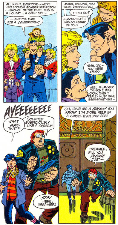Maya transported the Forever People to Earth where Mark commenced to drinking. He fell prey to Fyre, a human agent of the Dark. (#3) His old friends tried to intercede but failed to stop the Dark's human agents from swarming and overtaking them. (#4)
