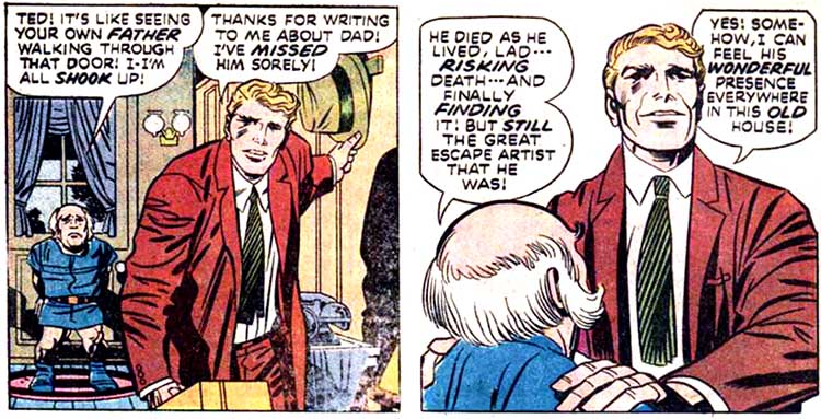 Oberon reunites with Ted Brown, son his old friend, the original Mister Miracle. From Mister Miracle #10 (1972); art by Jack Kirby and Mike Royer.