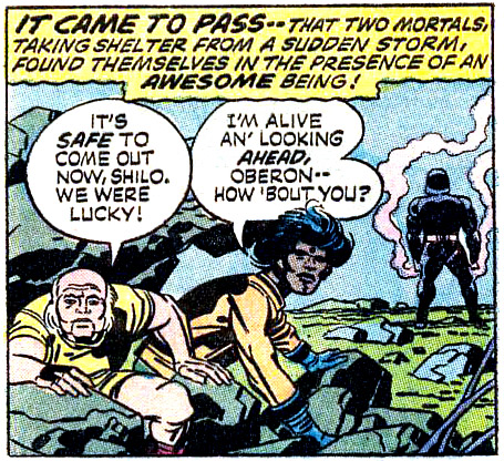 Oberon and Shilo Norman are left on Earth after the gods depart, witness Darkseid. From Mister Miracle #18 (1974); art by Kirby and Royer.