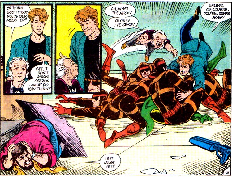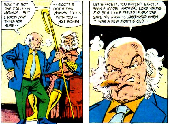 Oberon teaches a lesson in fathering to Scott's father. From Mister Miracle vol. 2 #4 (1989); art by Ian Gibson.