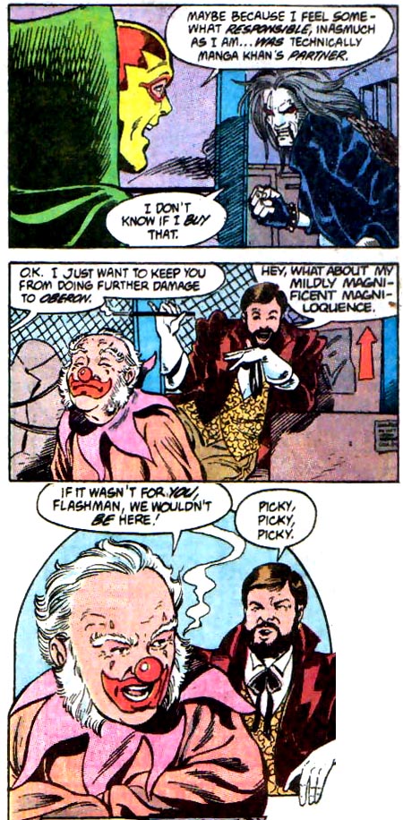 Khan escorted them from his cluster ship back to the Justice League and offered some explanation to Scott's friends. Ice in particular was angry about the deception, as she'd been concerned for Oberon's well being. Mange Khan also made an exchange with the JLA: his assistant L-Ron for the captive Despero. (#42) L-Ron assumed Oberon's role in the Justice League after this. Oberon took a leave of absence when Scott resigned. Max was sad to see him go, saying that Oberon was "the heart of the group." (#45)