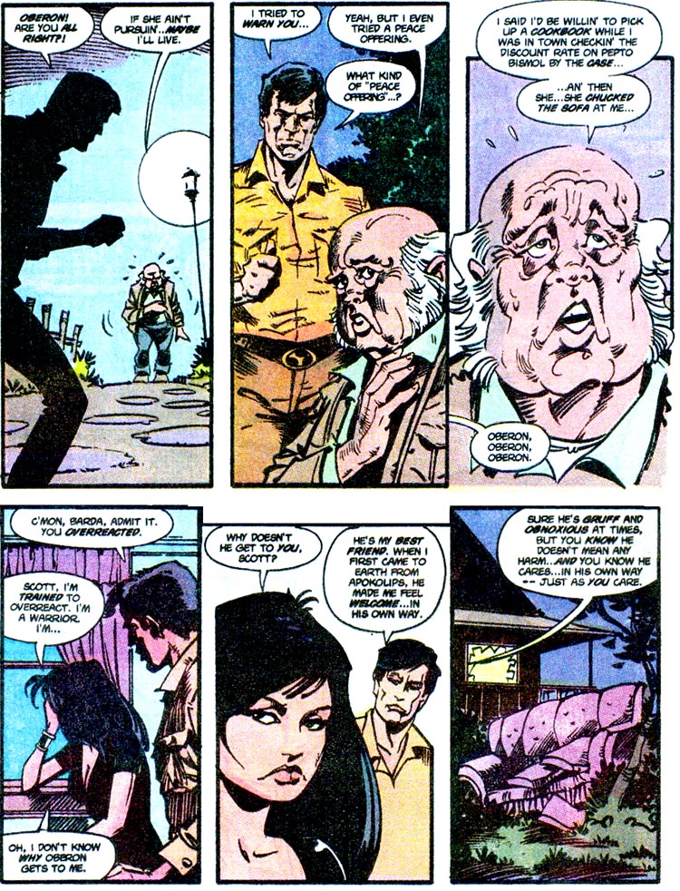 Oberon was seriously injured when the Dark attacked Scott. He was found and taken to safety by the returning Ted Brown (#5) and the two went on a bender. (#7-8)