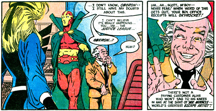 Oberon accompanied Mister Miracle (and got a goodbye kiss from Fire). The first show at Madison Square Garden was interrupted by Manga Khan. The Head had been an agent of Khan, and Funky had in fact signed a contract for a galactic tour to promote the Miracle Misters. Oberon, Scott, and Flashman were transported to Khan's ship and reluctantly agreed to the deal. An android duplicate of Mister Miracle was sent back to Earth to replace Scott in the Justice League. (Justice League International Special #1)