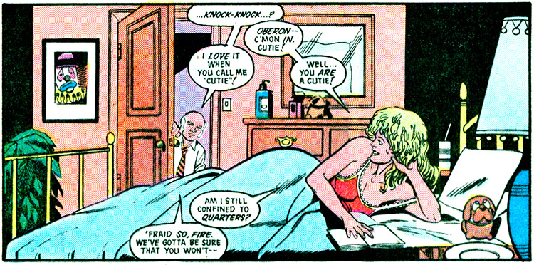 Oberon flirting with Fire. From Justice League International #27 (1989); art by Ty Templeton and Joe Rubenstein.