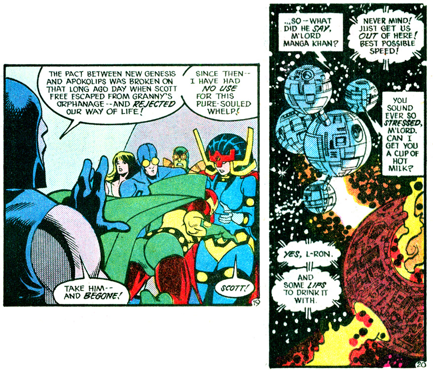 Darkseid claims to have no interest in Scott. Manga Khan's Cluster ship departs from Apokolips. From Justice League International #21 (1988); art by Ty Templeton and Joe Rubenstein.