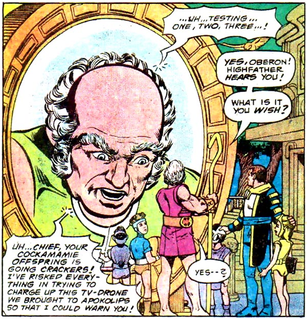 Oberon had always taken the stature of the "gods" in stride, and didn't hesitate to speak directly with them. He never cared for Highfather, who had settled in for an extended stay. (#3) Oberon counseled Highfather about his son, warning that Scott harbored unresolved anger about being given to Darkseid as an infant. (#4)