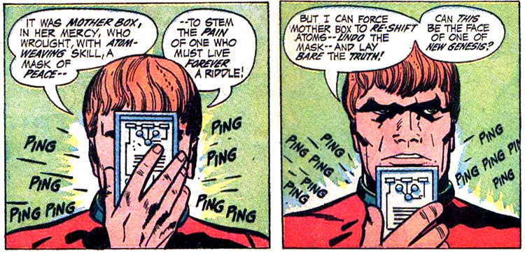 Orion uses his Mother Box to conceal his true face, which is savage and betrays his true parentage. When sufficiently enraged, Orion's face can revert to its natural state despite the presence of Mother Box.