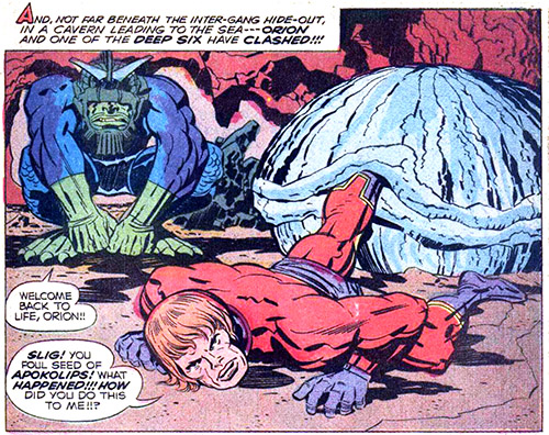 From New Genesis, Highfather bade Orion to investigate the death of a god, Seagrin, on Earth. Seagrin had lived in the oceans and was murdered by the Deep Six, minions of Darkseid. With the help of Det. Lincoln, Orion disabled a "jammer" that had masked Apokolips' presence from his Mother Box. The trail led to Seagrin's killer, Slig of the Deep Six. (#4) In an evenly matched battle, Orion ultimately dislodged Slig's helmet (which housed a Mother Box), and killed Slig. (#5) Slig's cohorts retaliated by unleashing a great Leviathan from the sea. Lightray disobeyed Highfather by joining Orion's battle on Earth. Lightray used his power to purge the evil from the Deep Six's control hub. The seed grew anew, into a great Glory Boat that smashed the Leviathan to bits. (#6)