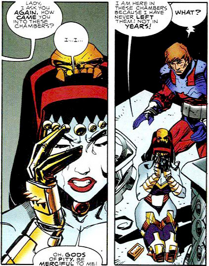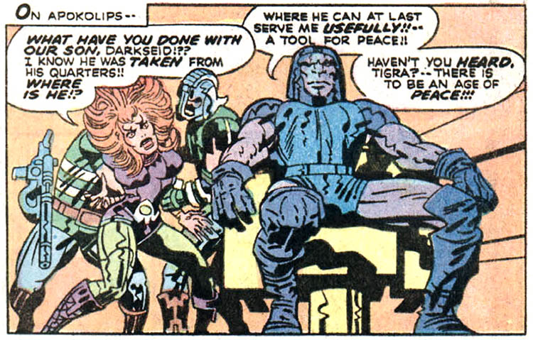 Darkseid barely tolerated Tigra but he was intent on fathering a proper heir. After her marriage Tigra met once more with her former lover, Captain Hathek. Darkseid found them kissing and unleashed his fatal Omega power on Hathek. (Orion #2) Tigra soon became pregnant but Darkseid knew that Heggra would reign for many more years. He did not want his heir to be born before he could assemble his own power base, so he put Tigra into a bio-freeze unit where she remained for a thousand years. When she emerged, Heggra was still the queen. (Jack Kirby's Fourth World #10)