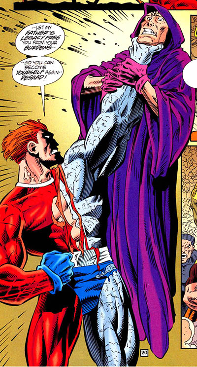 It was a time for family matters. Orion's grandfather (Darkseid's father), Yuga Khan, returned from eons of imprisonment and assumed total control over Apokolips and the power of the Source. Darkseid was drained of all power. (#17) Darkseid told Orion that the gods were literally incapable of killing their own parents or children, so they would need a more creative way to destroy Khan. (#19) Orion hesitantly agreed to an alliance (#20) and they hooked themselves up to the Lump (a being of great telepathic power) in order to enter a nonphysical plane. Here, Darkseid insisted, Orion would be able to kill him. Supposedly this would circumvent the familial killing rule and the laws of the universe would be altered. They would exit from the Lump's astral world and Darkseid would be able to slay his own father. But Orion refused to make this "virtual kill," because it would be the ultimate act of self-loathing. Meanwhile Khan manufactured his own end by making a second attempt to enter the Source. As before, he was imprisoned by it. (#21) Notes: The premise against killing one's parents or children was contradicted within this series when Darkseid killed Kalibak, in issue #12. The rule was ignored by future writers.