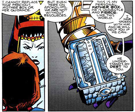 Orion found Darkseid waiting for him on Earth, but the tyrant favored erudition over competition. Darkseid was toying with Earth from afar. He returned to Apokolips and ordered his minion, Desaad, to activate his Fear Machine on Earth, which was immediately detected by Orion's Mother Box. (#2)