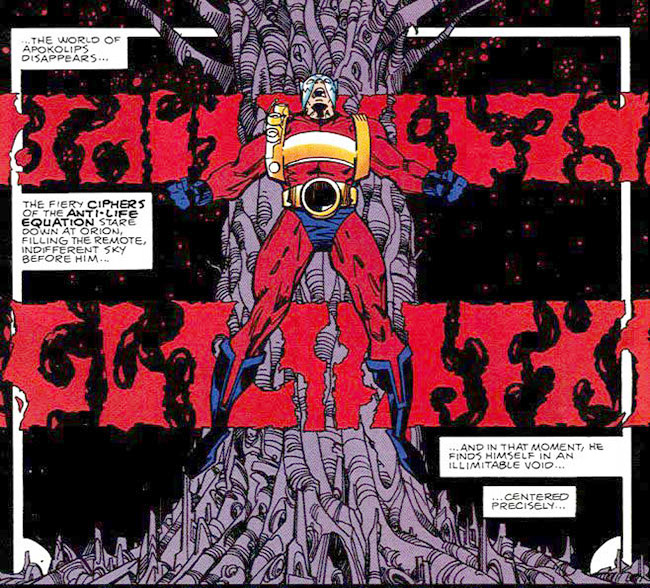 Kirby's original epic ended in 1972, but he returned to DC in 1984 with the edict to create an "ending" to his original series. These tales continued the story directly from the end of New Gods #11. However, these latter day stories were later removed from continuity by the Crisis on Infinite Earths. And if that's not confusing enough, New Gods had been revived before Kirby's return, in 1977 (see below). Both of these eras were later viewed as out-of-continuity. Kirby's return went something like this…