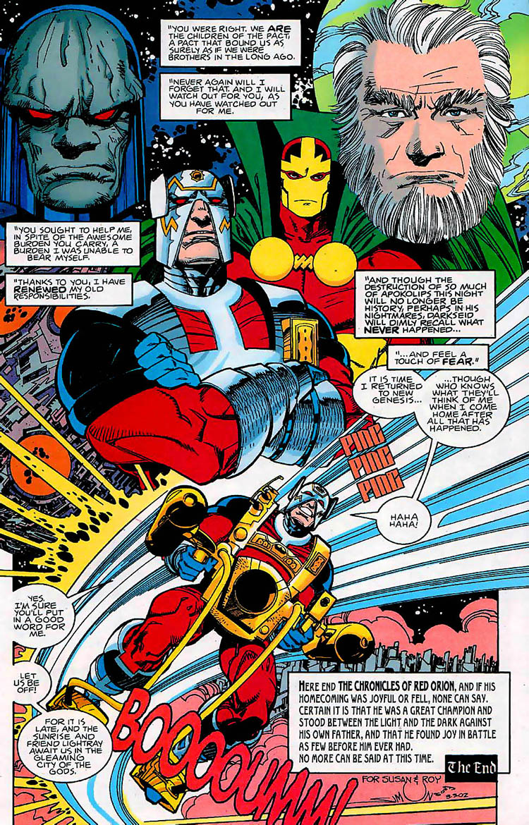 Orion's sense of self had been shattered, and it was his "step-brother," Scott Free, who brought him back. When Scott approached, Orion immediately recognized that Scott possessed the power of the Anti-Life Equation. Scott staged an attack from Apokolips then feigned injury so that Orion would take up Scott's yearly mission — to deliver flowers to Apokolips as a memorial to the people Scott had inadvertently killed by using the Equation. Orion disguised himself as Mister Miracle and was captured. He freed himself using the Astro-Force, which revealed him to Darkseid but allowed him to complete the mission. Afterwards, Orion was filled with a renewed sense of purpose and responsibility, and he returned to New Genesis. (#25)