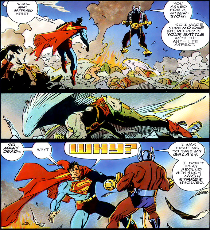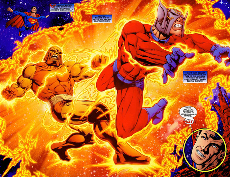 Continued chaos unleashed an ancient unstoppable beast called S'ivaa on New Genesis. Highfather commanded Orion to work with Superman and they managed to push the monster through it's own rift in space. (#10-11)