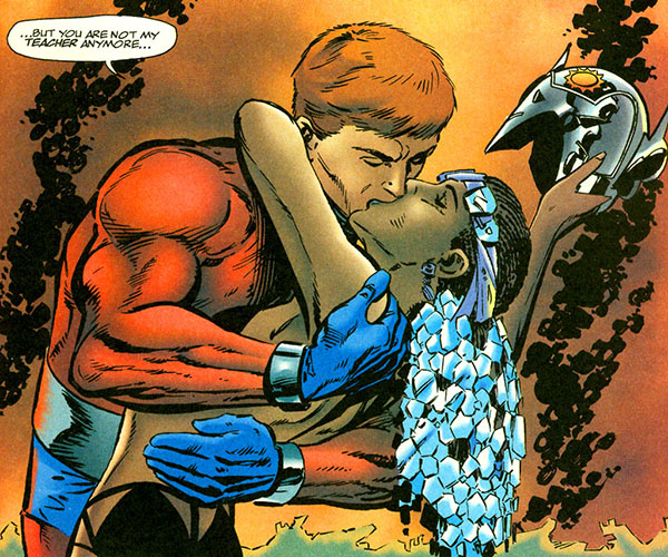 Orion was despondent so his friends, the Forever People, took him to the home of Valkyra, his former trainer. In her frigid hideaway, she challenged Orion to combat in a gravity well. The fight drew a large crowd and her attack was merciless and painful. Orion finally shook off his preoccupations and rallied with savage fury. (#7) Soon the two of them admitted their mutual passion for one another. Their first kiss was so powerful it sent a wave of love across New Genesis. It was perceived by Beautiful Dreamer as a sign of spring. (#11)