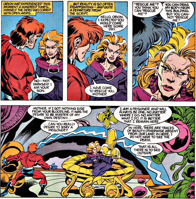 Orion was still set on liberating his mother Tigra from Section Zero on Apokolips (Hunger Dogs was no longer part of post-Crisis continuity). Back home, the Commander was publicly questioning Orion's loyalties. (#7) Orion met Jovita during his quest. She was a rebel leader of Hunger Dogs and a brief love interest. (#8) With her help, and by infiltrating Darkseid's troops, Orion located his mother. (#9-10) Their reunion was nothing he had expected. Tigra was blase when she saw him and insisted that she could not be rescued. Despite her captivity she was by then too accustomed to the luxuries afforded to her on Apokolips. Orion left her and claimed to his friends that he had not found her after all. (#12) Note: The story reasserted that Tigra hadn't seen Orion since he was born.