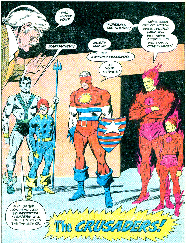The Crusaders: Barracuda, Rusty, Americommando II, Fireball, and Sparky. From Freedom Fighters #7 (1977); art by Dick Ayers and Jack Abel.
