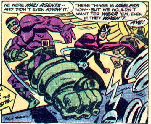 Spitfire calls the roll of Marvel's Crusaders. From Invaders #15 (1977); art by Frank Robbins and Frank Springer.The Crusaders disavow their weapons after learning they came from the Nazis. From Invaders #15 (1977); art by Frank Robbins and Frank Springer.