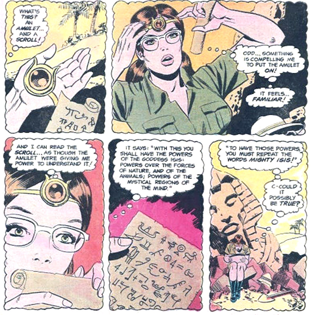 Sometime in the late 20th century, an American teacher named Andrea Thomas traveled to Egypt as part of a scientific expedition. While digging alone at one of the sites, she discovered the amulet tiara and scroll. Something compelled her to put on the tiara, which felt oddly familiar to her. She then discovered that she could read the scroll, as if the amulet had given her the knowledge to understand the ancient hieroglyphics. It read "With this you shall have the powers of the goddess Isis: powers over the forces of nature, and of the animals; powers of the mystical regions of the mind. To have those powers, you must repeat the words 'Mighty Isis!'" Andrea felt compelled to try, and the greatest of heroines was reborn.