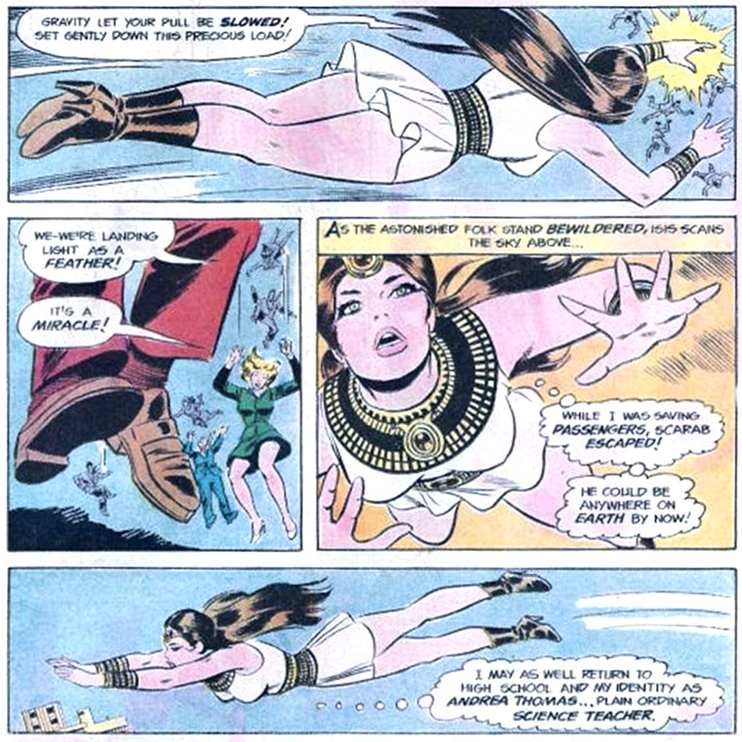 Shazam! was expanded in 1975 to an hour-long time slot with the addition of The Secrets of Isis, which featured high school teacher Andrea Thomas, who discovered an ancient Egyptian amulet while on an archaeological expedition. Like Billy Batson (Shazam/Captain Marvel) before her, Andrea transformed into a super-hero by intoning the magic words, "Oh mighty Isis!" Also like her counterpart, the heroine received her powers from the ancient Egyptian goddess.