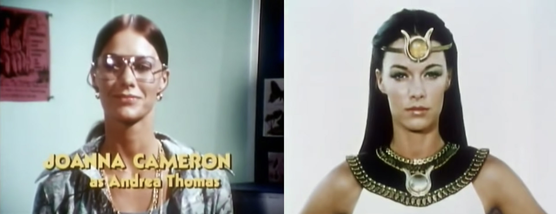 Isis, aka Andrea Thomas, was played by Joanna Cameron. Thomas was a high school teacher who had discovered an ancient Egyptian amulet while on an archaeological expedition. When in the possession of the amulet, Andrea has but to speak the magic words "Oh mighty Isis!" and she is transformed into a super-powered heroine. Andrea's supporting cast included a pet myna bird named Tut, fellow teacher, Rick Mason, and students Renee Carroll and Cindy Lee.