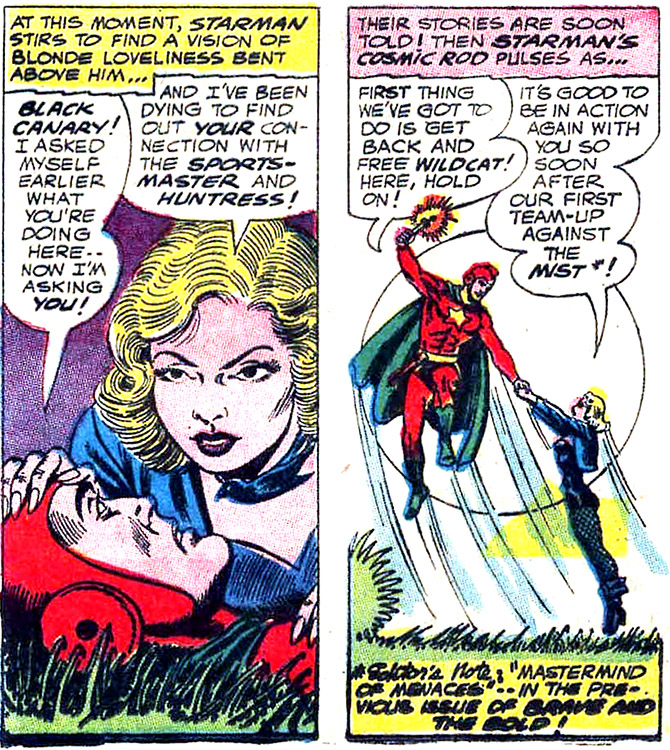 When the JSA went back into action (The Flash #137), she resumed her Black Canary identity, and participated in five JSA team-ups with the Justice League of America, on Earth-One.