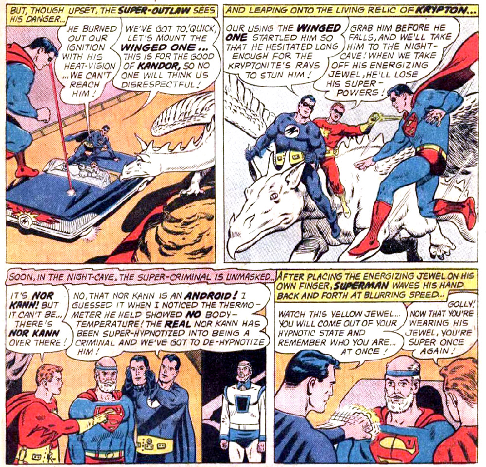 In their next outing as Nighwing and Flamebird, they were summoned to Kandor when a super-villain began terrorizing the city. This "Thief of Kandor" was actually Nor-Kann himself! He was hypnotized by the Superman Revenge Squad to dress like Superman, and gained super-powers with a ring that collected yellow sun energy. When Superman came down Scarlet Jungle Fever, it was down to Flamebird (Jimmy) to try to catch the thief. During this tale, Nor-Kann set a Kryptonian telepathic hound on Jimmy; it befriended him instead, and Jimmy dubbed him the "Nighthound." When he recovered, Superman rode with Jimmy on the back of a dragonlike being called a Winged One to solve the mystery. (Superman's Pal, Jimmy Olsen #69)