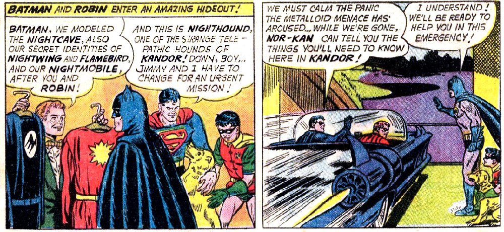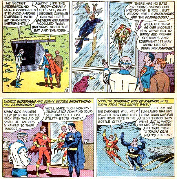 Superman ventured into Kandor to stop him, taking Jimmy Olsen with him. They were greeted by scientist Nor-Kann (a friend of Kal-El's parents), who helped Superman disguise himself. Taking a page from Batman's book, he and Jimmy used names inspired by Kryptonian birds: Superman and Jimmy became Nightwing and Flamebird. As the "Dynamic Duo of Kandor," they wore utility belts and jet packs to go investigating. Back at their "Nightcave," they recruited help from Van-Zee to penetrate Ol's compound.
