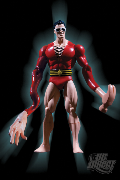 There have been several versions of Plastic Man immortalized in plastic. In 1979 he was made into a stretch figure for the Mego Corporation Elastic Superheroes line (which is highly sought after by collectors and extremely rare). He was a part of Kenner's Super Powers action figure line in 1986. In 1998, Plastic Man was included in Hasbro's line based on the JLA comic book. When DC Comics started its own toy company, DC Direct, in 1999, Plastic Man was one of its first action figures made. A second figure, this time an interpretation of the character based on the art of Alex Ross, was released by DC Direct in May 2006. In 2009, two versions of Plastic Man were released as part of the Batman: The Brave and the Bold tie-in toy line. Plastic Man was also released as a figure, in DCAU style, in the Justice League Unlimited toyline in late 2009. A new, stretchable Plastic Man figure was recently released in the Batman: The Brave and the Bold toy line, in a multi-pack with Batman and Rubberneck. In 2010, Mattel released a Plastic Man figure as part of the DC Universe Classics line. This figure was exclusively sold at the San Diego Comicon.