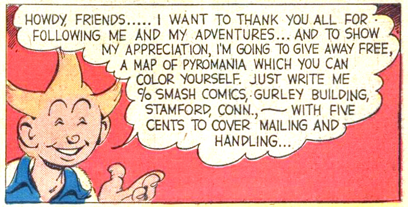 Howdy, Friends..... I want to thank you all for following me and my adventures... and to show my appreciation, I'm going to give away free, a map of Pyromania which you can color yourself. Just write me c/o Smash Comics, Gurley Building,Stamford, Conn., — with five cents to cover the mailing and handling...