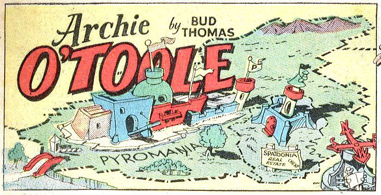 This solicitation in "Archie O'Toole" from Smash Comics #8 (Mar. 1940) which tells kids to send in for a free coloring map to Archie's kingdom, Pyromania!