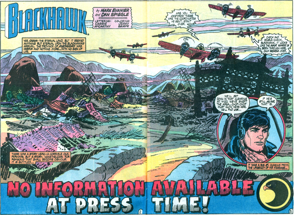 Evanier: Yes, I had a number of fights with DC’s promotions people. The big story was that each month they at each month, as an editor, I would have to tell them about upcoming issues, so when they did the solicitations/press releases, they would be able to say things about the story, the art, and cover. I would send in the Blackhawk listings dutifully and the guy there would lose them and print "No information available at press time." So I titled the last issue of Blackhawk "No Information Available at Press Time," just to be ornery—so that the listing would be right at least once!