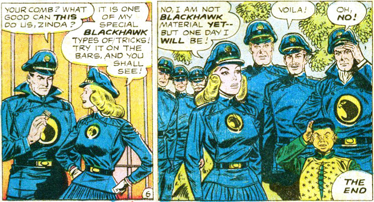 In 1958, they were joined by a Lady Blackhawk, Zinda Blake. (Blackhawk #133) In her first adventure, she failed to make the cut, and she appeared off-and-on for some time, and eventually disappeared amid the time fluctuations caused by Zero Hour. She emerged decades in the future. (Guy Gardner #24). She was invited by Oracle to join the Birds of Prey as their pilot. (Birds of Prey #75)
