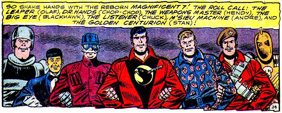 In order to keep the Blackhawks hip to the times, an embarrasingly bizarre move was made beginning with issue #228 (Jan. 1967) to recast the Blackhawks as true superheroes! That issue featured the Justice League on the cover, and on the next, Blackhawk rather desperately cried to the reader, “Don’t quit on us! Everyone says the Blackhawks are washed up… but you be the judge!” They were now known as the Leaper (Olaf), Dr. Hands (Chop Chop), the Weapons Master (Hendrickson), the Big Eye (Blackhawk), the Listener (Chuck), M’Sieu Machine (Andre), and the Golden Centurion (Stan). (#228-241) Just before it was canceled, DC attempted to return the Blackhawk to its traditional setting (and uniforms). (#242-243)