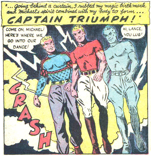 By touching a T-shaped birthmark on his wrist, Lance Gallant would combine with the spirit of his dead brother, Michael. The lightning-fast transformation infused the resultant Captain Triumph with super-strength, flight, and invulnerability. He needn’t touch the mark personally; touching it against other surfaces also triggered the transformation. As twins, they had always shared an empathic bond. In spirit form, Michael also had limited control over the material world. With great effort he could convey the essence of a message to people and animals, and could move matter in minor ways. After changing back to normal, Lance could find himself healed of mortal injuries. One advantage of Michael’s spirit form was that he was intangible and could investigate anyplace.