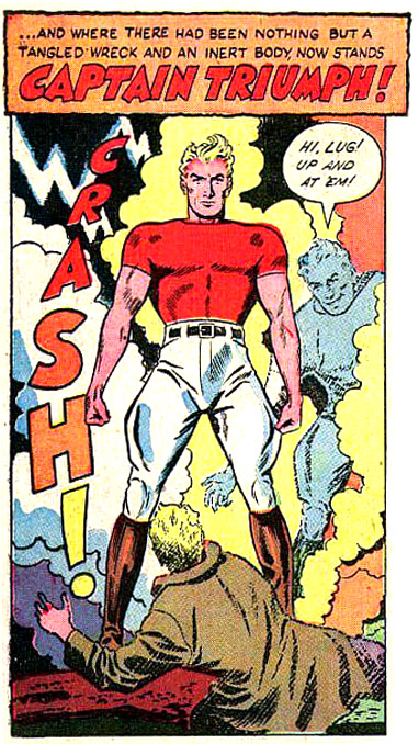 Lance and Michael Gallant were born in 1919 with identical T-shaped birthmarks on their left wrists. Michael joined the U.S. Air Corps while Lance became a journalist. No matter what their differences, they shared an unbreakable empathic bond. In the fall of 1942, Lance and Kim Meredith were watching her boyfriend, Michael, come in for a landing. Soon after he landed, it was apparent something was amiss and the hangar exploded. Even though Lance found his brother alive, Michael’s life gave out just after asking Lance to care for Kim. Lance cried to the heavens for revenge and his brother’s spirit appeared to him in a flash of lightning. Michael’s spirit offered Lance terrific powers: super-strength, flight, and invulnerability. All he need do was touch the birthmark they had shared and Michael’s spirit would combine with Lance’s body, empowering them to become Captain Triumph. Naturally, their first mission was to solve the bombing that took Michael’s life. Some blamed Michael’s friend, Pop Mason, but the true culprit was the Nazi, Baron Von Bragg. (Crack #27)