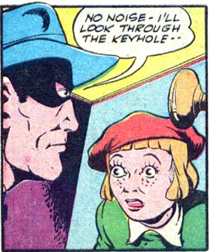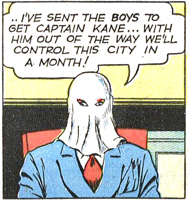 O'Brien's appearance in this series borrows some things from the Clock's Quality Comics adventures. His rather KKK-like white hood is exactly like that of his white-hooded foe, Big Shot, from Crack Comics #1 (1940). In that story, the hooded figure turned out to be the city mayor.