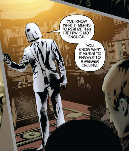 In 1938, New York state is taken over by the Justice Party, a front for a totalitarian organization bent on solving society's problems with an iron hand. The party quickly implemented sweeping new powers and created a Black Legion police force. Tony Quinn, who succeeded O'Brien's as District Attorney recalled that Brian had found the law too limiting, which is why he chose to operate outside of it as the Clock. (Masks #3) Quinn soon lost his sight and also became a masked adventurer, the Black Bat.