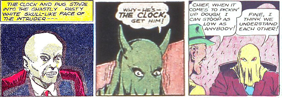 The Clock bears the distinction of having been the first masked hero created for a comic book. There are precedents in other media, but in comics, the Clock’s only contemporary was Dr. Occult, who’d been introduced a year before in National’s New Fun #6. Dr. Occult was not masked, but possessed mystical abilities.