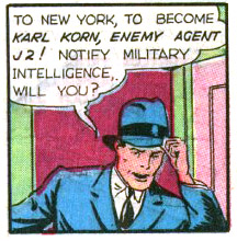 Bruce Blackburn was one of three regular adventurers who took super-brief forays into costumed heroing (the others being Chic Carter and Wings Wendall). The name of this feature was “Captain Bruce Blackburn, Counterspy.” In his first adventure, Captain Bruce Blackburn and his double, Lieutenant Jackson, faked their own deaths by placing two medical school corpses into a car, lighting it up, and pushing it off a cliff. This was necessary because someone had leaked Blackburn’s picture to the newspapers. To hide their identities, it was necessary to visit a plastic surgeon. Dr. Bland changed both Blackburn’s and Jackson’s features so they were now different from their originals, and both men could now pass for identical twins. Using an antique store as a front for their espionage, they caught the man who’d blown their covers. (Feature #32)