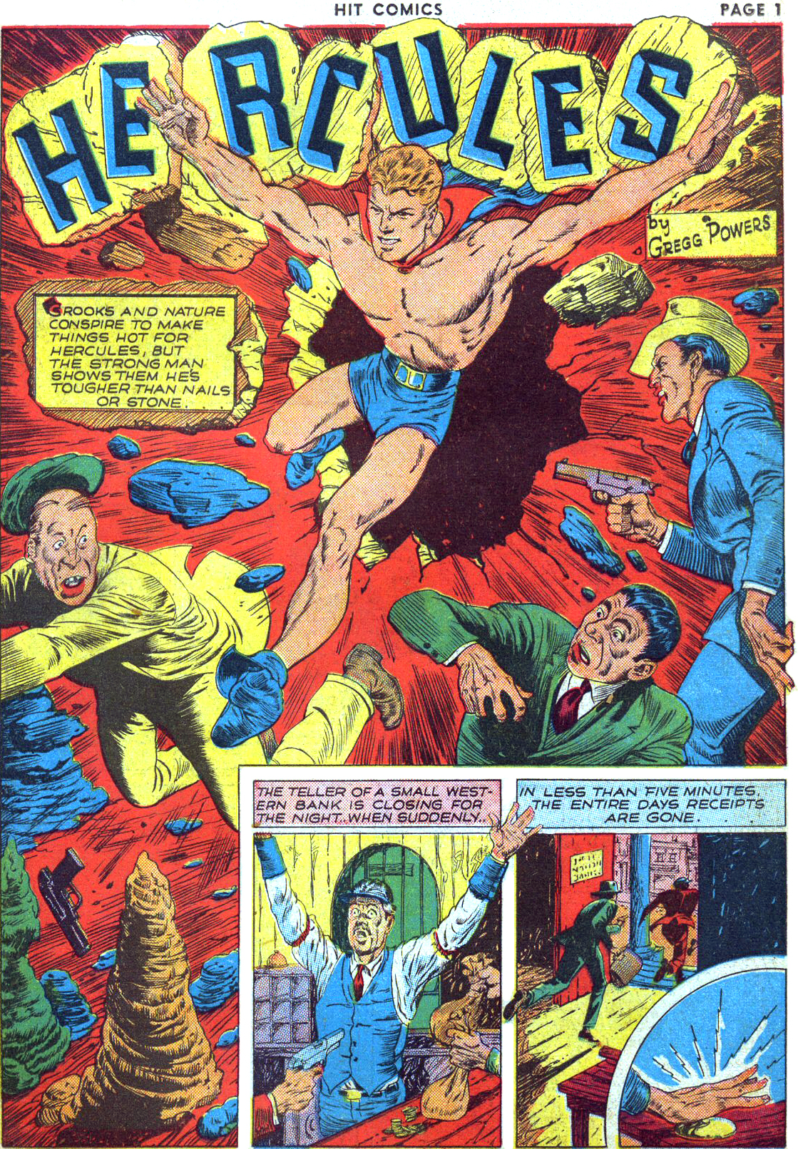 If anything, Hercules resembled Quality’s own hero, Doll Man. Both features were created by Eisner/Iger men and both drawn at some point (though not created) by Reed Crandall. Joe Hercules’ first adventure attempted to move him a step away from Quality’s own fictional universe; the story asserted that Doll Man was only a character who existed in the comic books of Joe Hercules’s world. Before long, Hercules’s powers grew far beyond those of mortal men but the sales didn’t grow to match. It wasn’t for lack of promotion. Quality featured Hercules on the covers of Hit Comics #3, 10-17 and put him in the first feature slot. Curiously, “Hercules” was replaced by a similar strongman, Stormy Foster, and the two overlapped for a few months.