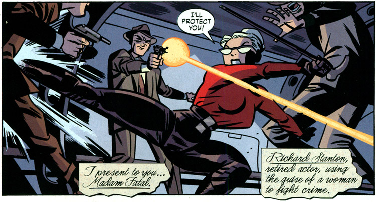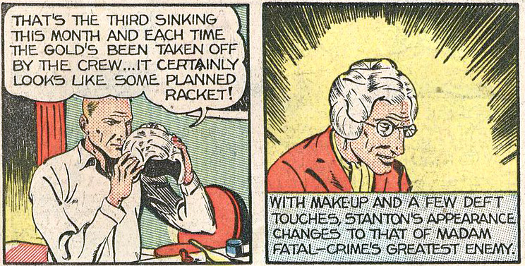 Richard Stanton Richard Stanton was an accomplished stage actor and female impersonator who retired in 1930 when John Carver kidnapped his daughter. Carver had been in love with Stanton’s wife, and committed the crime out of jealousy. When police could not recover the girl, Stanton’s wife died of grief, and he took drastic measures. He would get revenge on Carver by donning his last stage costume—that of a little old lady—to become the world’s first cross-dressing hero. No one ever suspected that the harmless old woman was actually a costumed mystery man—until it was too late. Eight years later, he caught up to Carver, who accidentally shot himself. But before he died, Carver revealed that Stanton’s daughter was still alive! (Crack #1)