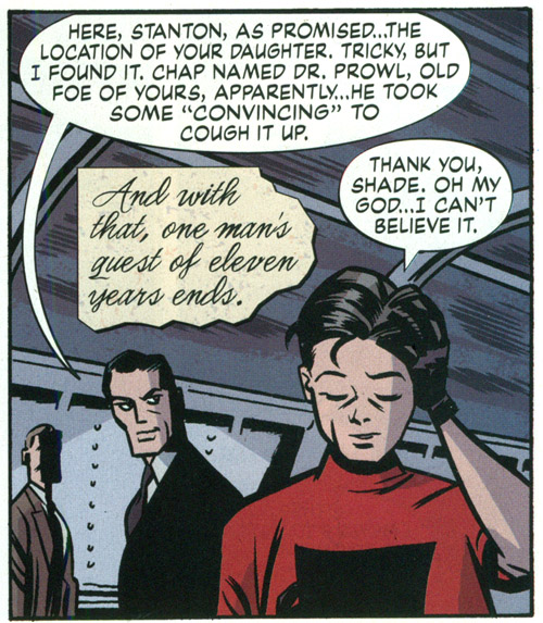 Madam Fatal was still active in 1944, when Stanton became an agent of the anti-hero (and sometime villain), the Shade. The Shade employed Madam Fatal to protect his own descendant, Darnell Caldecott. Stanton posed as Caldecott's assistant, Miss Sharp. Sharp escorted Caldecott to safety, and when his life was endangered by Nazis, revealed herself as Madam Fatal. The Shade arrived soon thereafter to relieve Madam Fatal, and presented Stanton with his payment—the information he'd sought for so long... the whereabouts of his kidnapped daughter. It seemed that she eleven years earlier by Dr. Prowl. (The Shade v.2 #4)