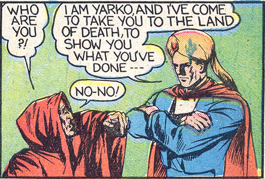 “Yarko” was prepared at the Eisner & Iger studio, but when Will Eisner separated from Iger to create his new Sunday Spirit Section, Powell moved with him. They retooled Yarko as “Mr. Mystic.” Powell’s last Yarko feature was Wonderworld Comics #10 (Feb. 1940), and Mr. Mystic debuted on June 2, 1940. Yarko continued through Wonderworld #33, so the two were published simultaneously for a time. (DC had a similar hero, Sargon the Sorcerer, who first appeared in All-American Comics #26, May 1941.)