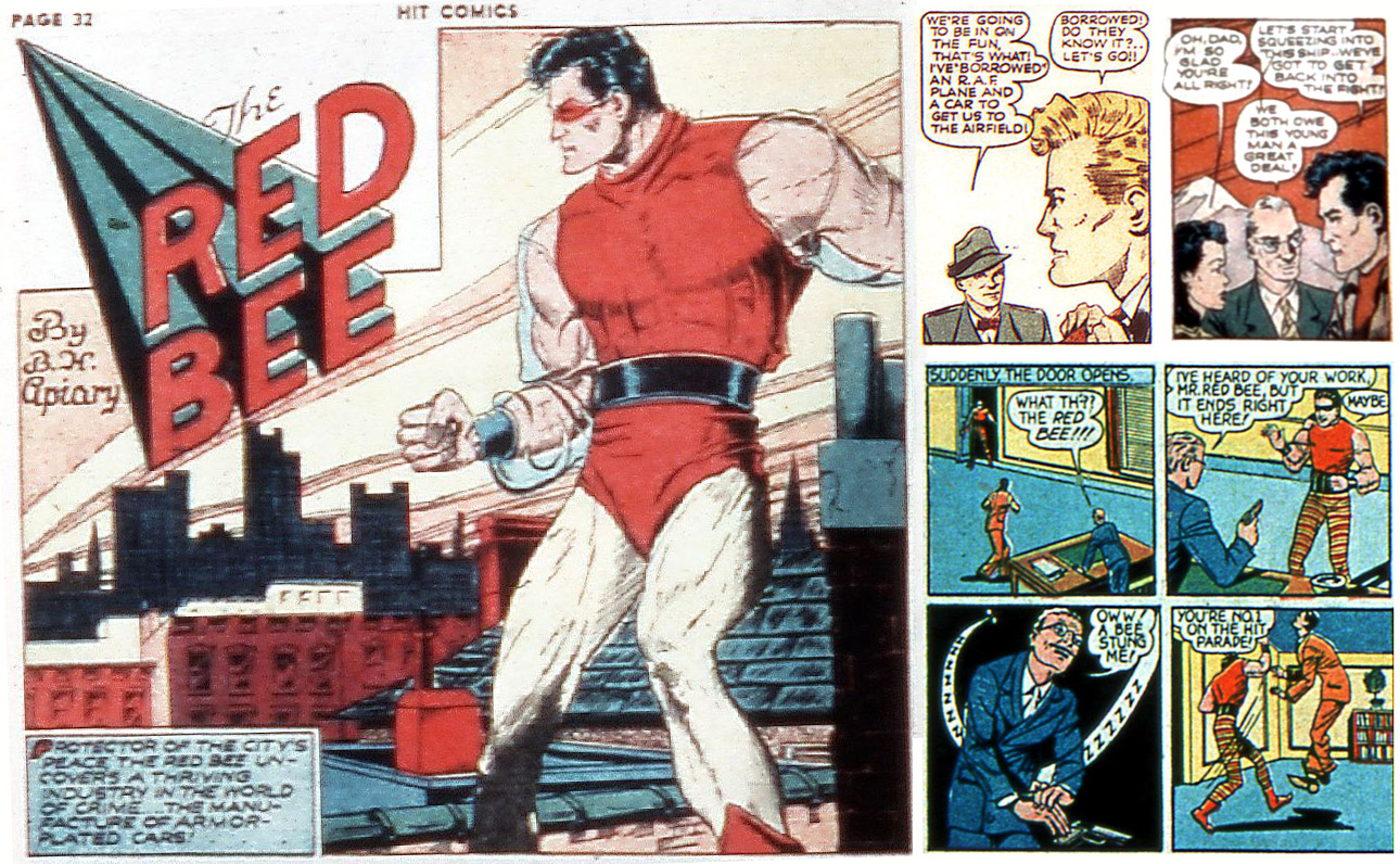 Rick Raleigh, the assistant District Attorney Hawkes of Superior City, decided to expedite the process of law and order by becoming a mystery man—the Red Bee! He dared to fight crime with naught but his own two fists and a trained bee named Michael. In his first case, he brought about the conviction of Boss Storm, head of a corrupt political machine. (Hit Comics #1)